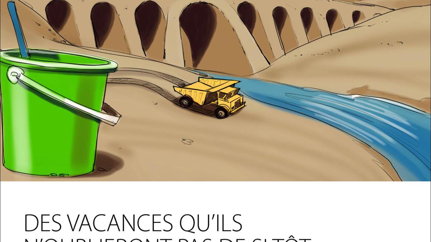 Maquette réaliste du barrage Manic-5 en sable créée par Studio Luigi Artisan pour une photo publicitaire d’Hydro-Québec. Un concept original mettant en lumière l’énergie renouvelable et l’esprit ludique à travers une scène familiale chaleureuse.
